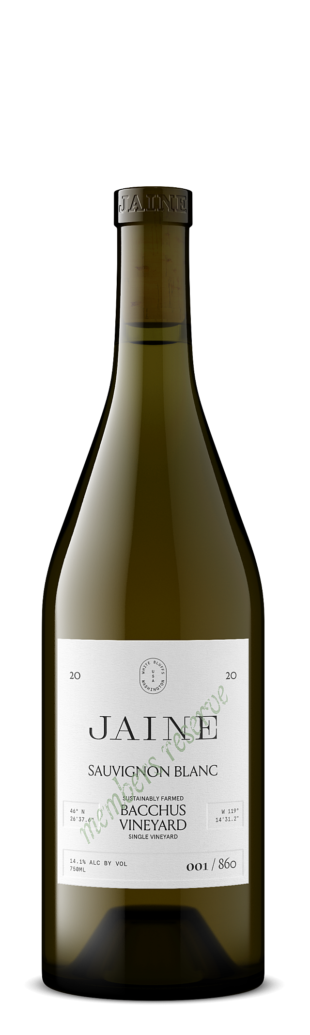 The 2020 Jaine Members Reserve Bacchus Vineyard Sauvignon Blanc was fermented and aged in a single concrete egg. The color shows maize to light straw. Aromas of caraway seed, lemon oil and oyster shell lead into flavors of orange marzipan, lime margarita and river rock. The mouthfeel is angular with a binding core of acidity. Crushed rock minerality continues on the finish, with lingering flavors of tart, bittersweet cider apple.